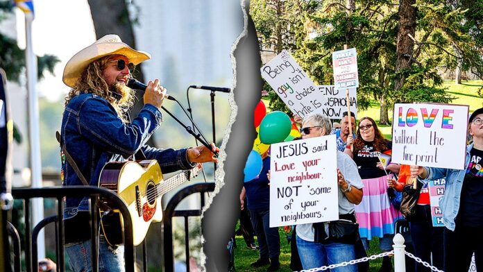 (Left) Sean Feucht, a U.S. songwriter and preacher, speaks during a worship rally in Edmonton, Alberta, Canada, Aug. 22, 2025. (Right) Members of the LGBTQ community held a protest after Feucht was permitted to perform on the Alberta Legislature grounds. (Ron Palmer/SOPA Images/LightRocket via Getty Images)