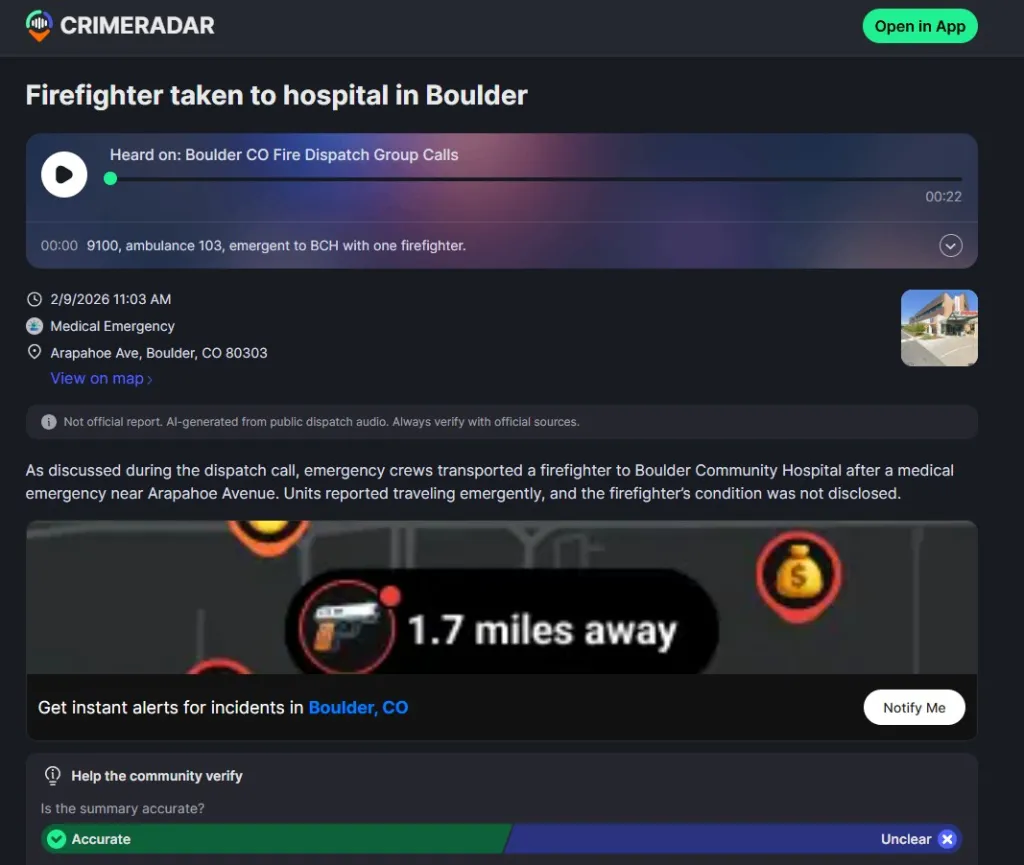 In Boulder, the app recently reported that a firefighter was taken to the hospital after a medical emergency in Boulder. The summary said “the firefighter’s condition was not disclosed.”